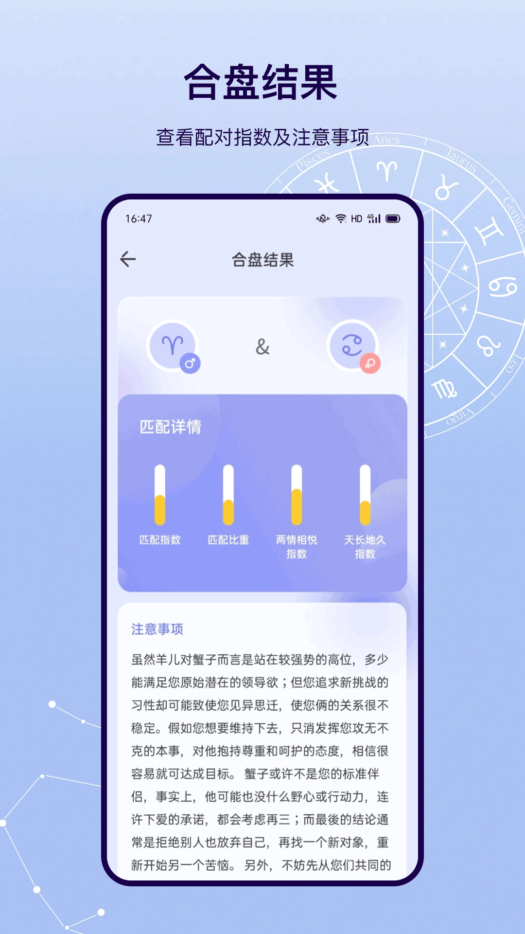 星座匹配功能:允许用户开展星座匹配操作,剖析两人的相合程度,为恋爱、婚姻等关系提供决策参考依据。
