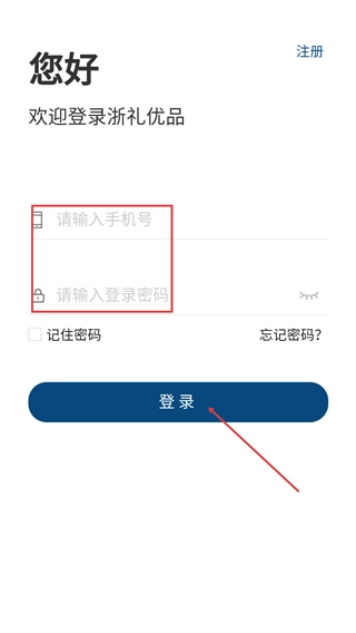2、进入登录页面后,依次填写【手机号】和【登录密码】,可根据需要勾选“记住密码”选项,最后点击【登录】按钮即可完成账号登录操作。
