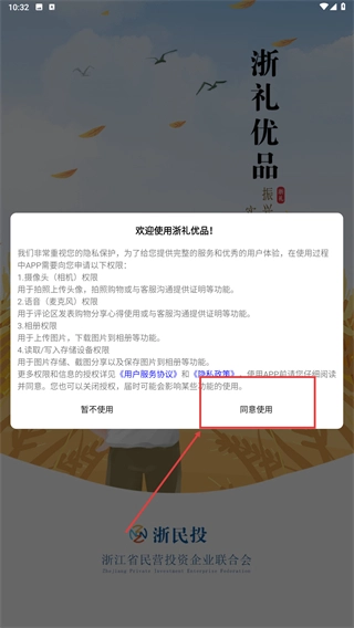 1、打开浙礼优品应用,仔细阅读权限申请说明,随后点击【同意使用】按钮,授予应用所需的各项权限,以便功能能够正常运行。