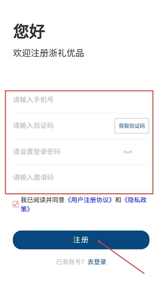 3、进入注册页面后,请按顺序填写【手机号】、输入【验证码】和【登录密码】,【邀请码】为可选填写项,勾选相关协议后点击【注册】按钮,即可完成账号的创建。