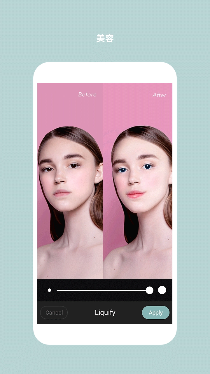 5、人脸识别功能:能够自动达成放大眼睛、优化笑容、瘦脸等美化效果;