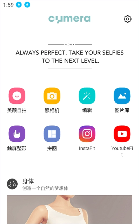 1、打开最新版的Cymera,在首页就能看到照相机、图片库、美颜自拍、触屏整形等常用功能的入口;