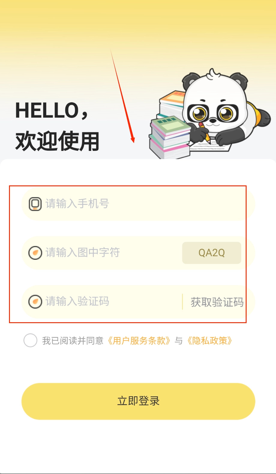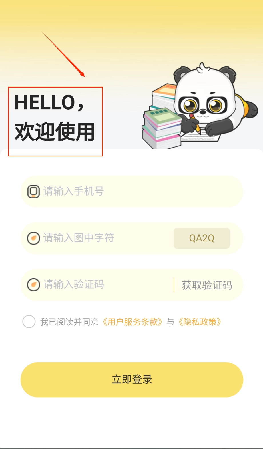 3、新用户登录时会看到温馨的熊猫欢迎界面,在渐变黄色背景上按顺序完成三步操作:输入手机号码、填写右侧显示的验证字符。