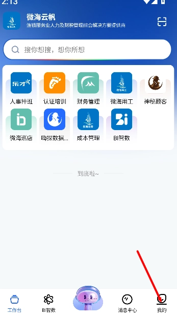 1、打开《微海云帆》软件后,点击右下角我的,进入个人中心页面。