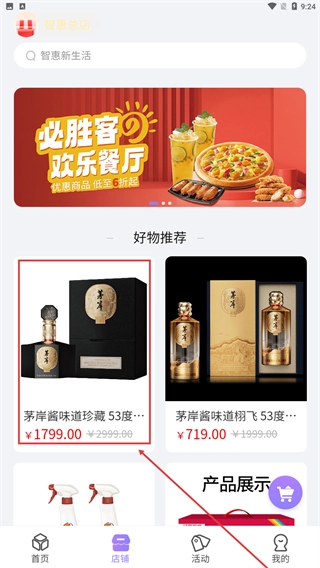 2、进入店铺页面后,找到【好物推荐】区域,挑选想要的商品(例如酒类),点击该商品进入其详情页面。