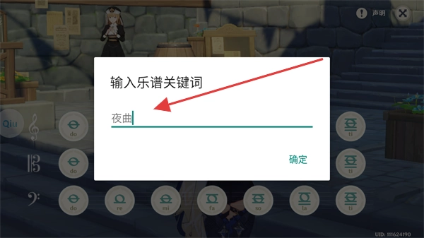 3、如需查找特定乐谱,点击输入框,输入乐谱关键词如【夜曲】后点击【确定】搜索。