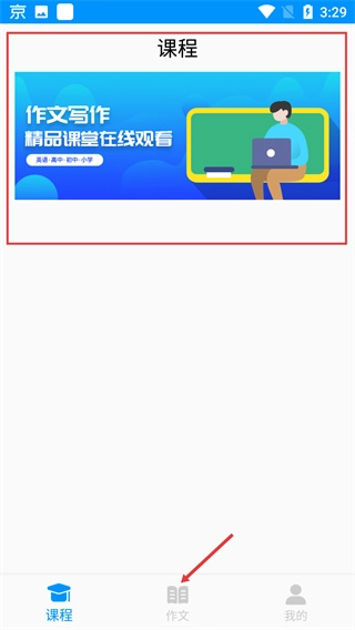 1、打开课程界面后,能查看【作文写作-精品课堂在线观看】的相关内容,点击底部的【作文】按钮,即可切换到作文功能模块。