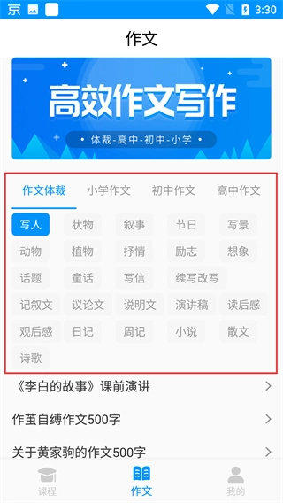 2、进入作文页面后,借助学段标签,挑选体裁分类来筛选内容。