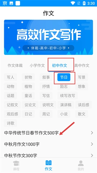 3、在作文页面,选择【初中作文】学段标签和【节日】体裁标签,就能查看对应的作文示例,比如《中华传统节日春节作文500字》这类内容。