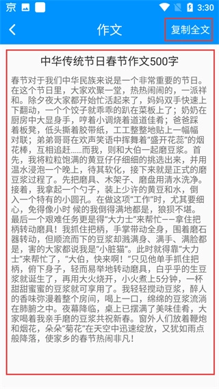 4、进入作文详情页,阅读《中华传统节日春节作文500字》的内容后,点击页面右上角的【复制全文】按钮,即可获取该作文的文本内容。