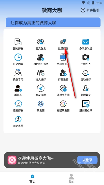 1、打开软件进入首页,点击批量群发