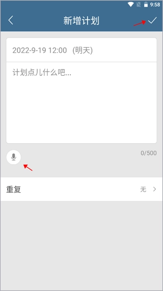 2. 通过手动输入或语音输入的方式添加未来计划,可根据实际需求设置重复规则,完成后点击右上角的“√”按钮进行保存。