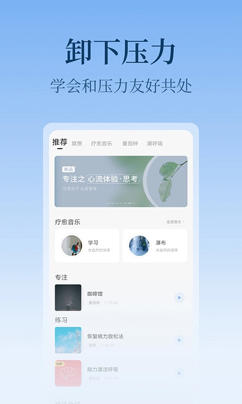 包含50+首原创疗愈音乐,涵盖减压、助眠、专注、正念四大类别。如“深海呼吸”脑波音乐采用θ波(4-8Hz)与自然海浪声叠加,有效降低皮质醇水平。