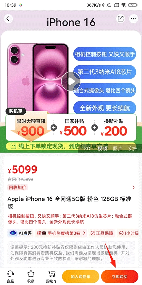 1、打开九机网,选择需要分期购买的手机,点击【立即购买】;