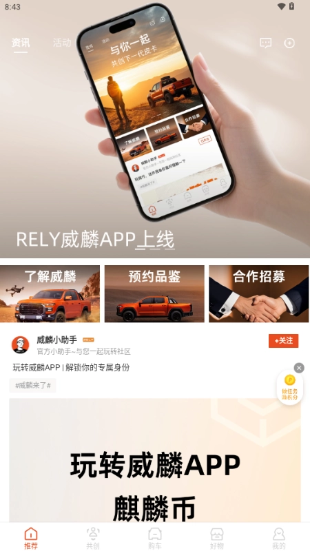 通过软件获取最新的品牌资讯与活动信息,保持对威麟品牌的关注与热情。软件设有积分系统,通过参与活动获得麒麟币,这些币可以在平台内兑换各种好物,如配件、数码产品等,增加了用户的参与积极性。威麟还支持在线购车配置查看,轻松分享购车信息,提升购车的便利性。