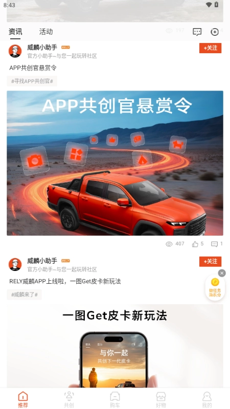 平台为用户提供了新鲜的资讯与热门话题推荐,确保用户始终能够接触到最新的行业动态与活动信息。用户共创与挑战的功能增强了平台的互动性与参与感,用户不仅是信息的接受者,更是内容的创造者。平台还提供了购车与配件选购的便捷服务,在同一平台上可以完成多项需求,极大地方便了他们的使用体验。