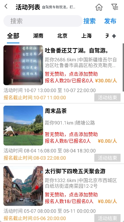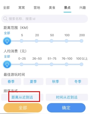 2、选择“距离从近到远”排序,即可找到离您最近的露营地点。