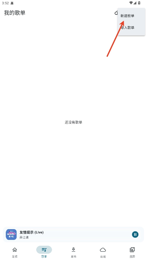 2、进入歌单管理界面后,找到“新建”按钮并点击,系统会弹出输入歌单名称的提示