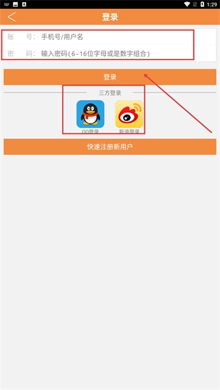 进入登录页面后,既可以在账号密码输入框中填写信息并点击【登录】按钮,也能够选择【QQ】或【微博】这两种第三方登录途径。