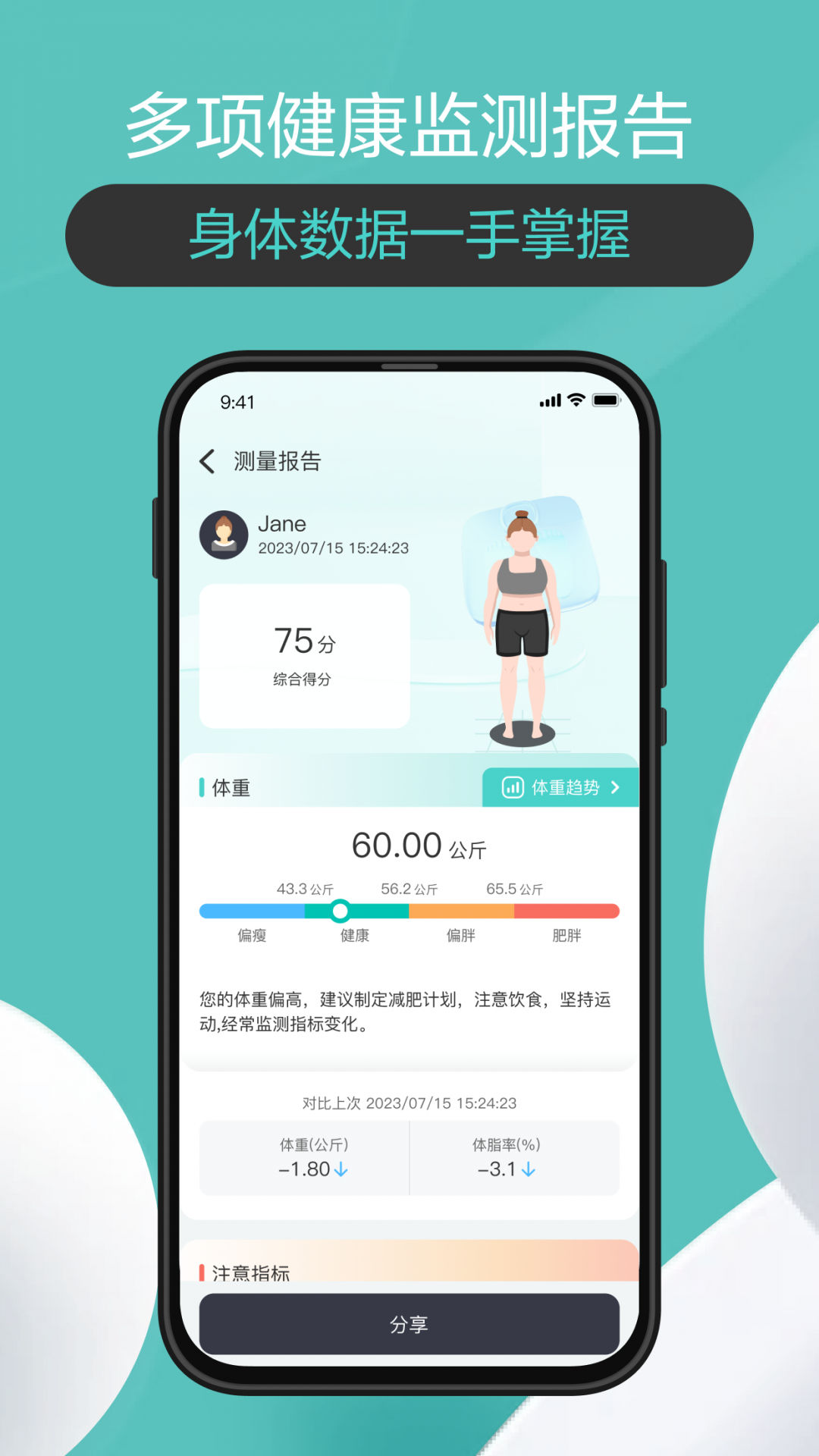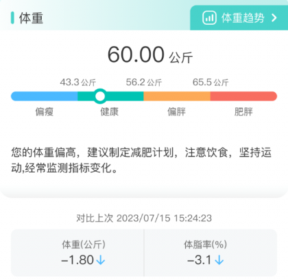 1. 能够及时了解并查看体重数据、体重变化走向以及脂肪和肌肉的占比情况。