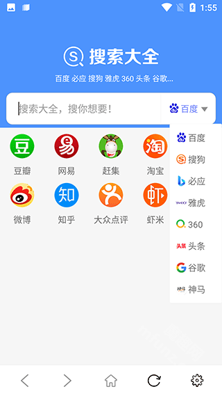 首页配备了百度、搜狗、必应等搜索引擎,用户能够根据需求自由切换使用。