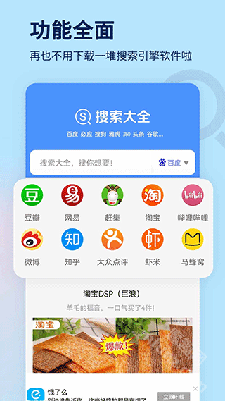 搜索大全也常被称作搜索大全引擎,是一款颇具实力的全能型聚合资源搜索工具。这款搜索大全整合了百度、搜狗、360、神马、头条、必应、雅虎、谷歌等国内外众多知名搜索平台的内容。而且搜索大全软件的操作方式十分简便,打开软件后直接输入想要查找的内容,就能一键完成搜索!