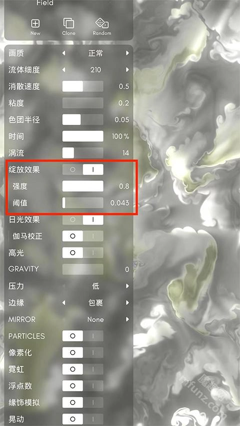 2、进入设置界面后,可对画质、流体粗细、消散速度、绽放效果以及阈值等各项参数进行调整。