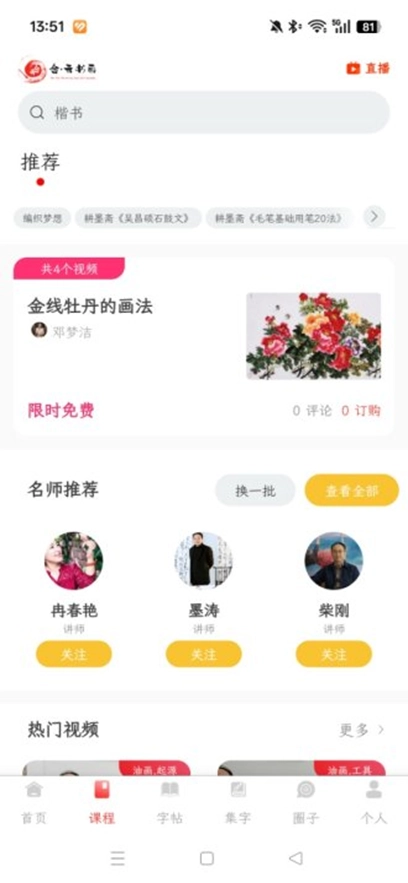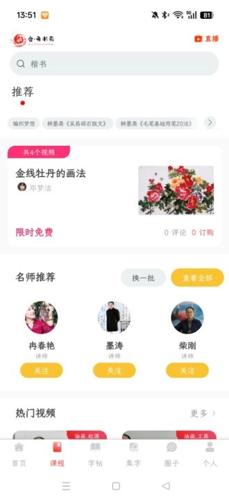 2、进入应用首页界面后,就能够开启各项书法专业类课程的学习。