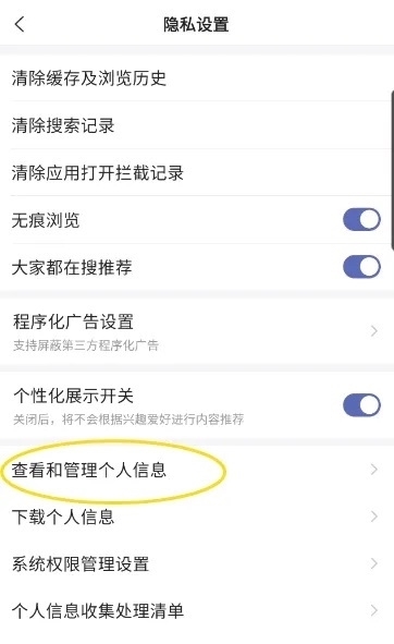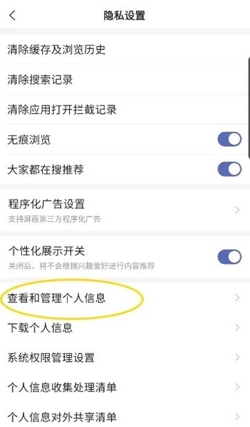 进入隐私设置找到查看和管理个人信息点击进入