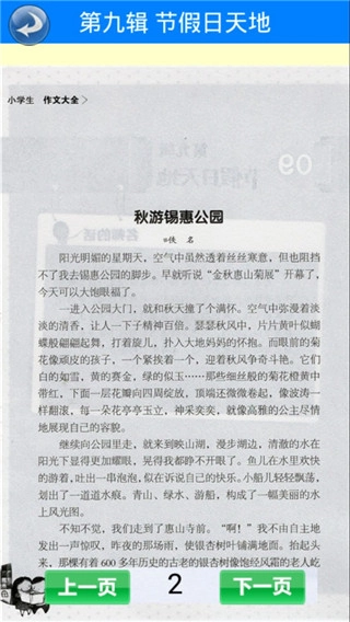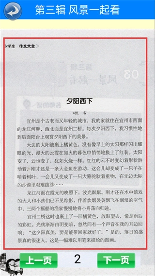 4、浏览至《夕阳西下》这篇写景作文时,可借助“上一页”“下一页”按钮进行页面切换,以阅读该作文的详细内容。