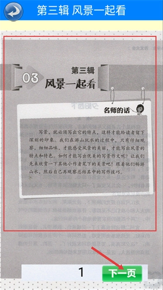 3、进入【第三辑-风景一起看】后,查看【名师的话】中的写景技巧,点击【下一页】按钮就能浏览具体的作文内容。