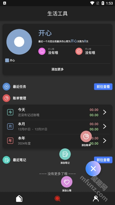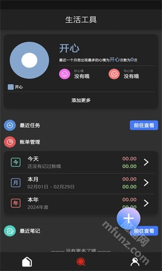 生活工具:包括添加心情、记录任务和账单,以及添加笔记等功能。