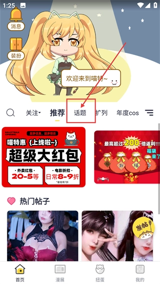 》是一款强大好用的漫画软件,可以通过匹配算法推荐符合他们兴趣和爱好的人,为您创建一个视觉上吸引人、实用且免费的网站,操作简单,用户还可以在软件中自由打扮他们的角色,让他们看起来像他们喜欢的样子,他们都在使用这个软件,每天在这里,他们都会更新国内外漫画展的新闻,这里也有很多关于漫画展览活动的信息,这是一个非常实用的漫画阅读工具,凭借软件中庞大而高质量的漫画资源。1、在【喵特】首页点击顶部的【话题】选项,就能切换到话题页面,查看各类兴趣相关的话题内容啦。