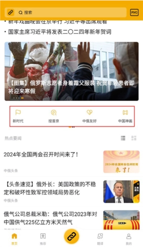 用户在首页就能浏览头条新闻,点击“搜普京”“中俄友好”等选项,可快速获取中俄相关的新闻资讯,此外还能查看中俄神画!