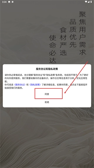 1、在服务协议和隐私政策,阅读条款后点击【同意-功能按钮】。