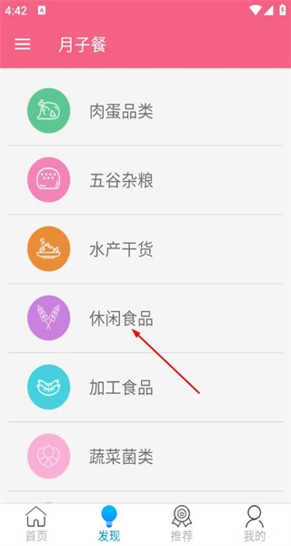 2、进入发现页面,看到肉蛋品类等分类,在分类列表中找到并点击休闲食品选项。
