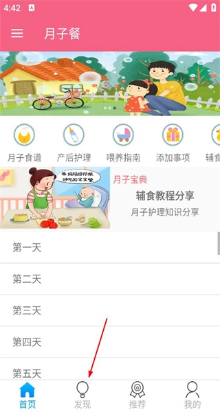 1、打开月子餐软件后,进入首页,看到月子食谱等功能选项,点击底部的发现选项。