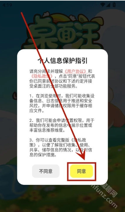 1、接着安装桌面汪App,打开该应用后,点击【同意】按钮来接受隐私政策。