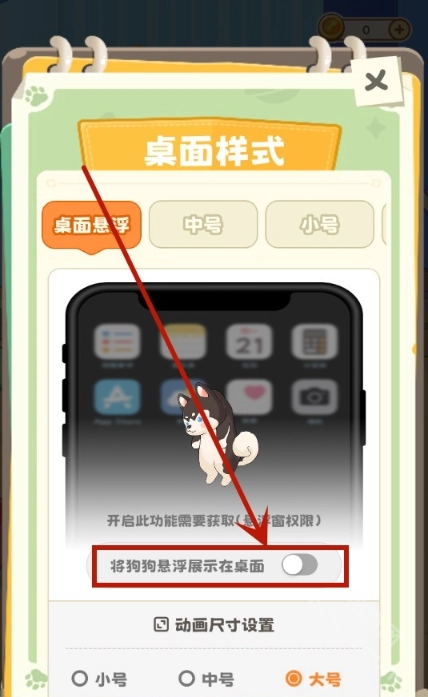 7、依据个人喜好挑选不同尺寸,同时开启【将狗狗悬浮展示在桌面】的选项。