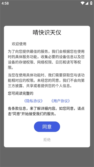 1、阅读隐私协议和用户协议后,点击同意即可进入App。