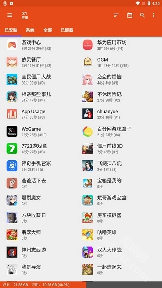 App Usage能够自动追踪并记录各个应用的使用时间,提供多种应用排序方式,方便用户管理和快速卸载不需要的应用