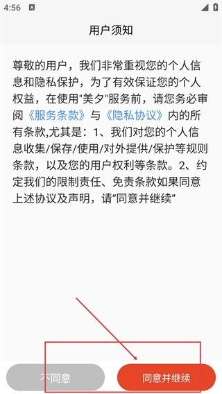 1、在【用户须知】页面,需先审阅【服务条款】与【隐私协议】,确认相关规则后点击【同意并继续】,方可进入后续操作环节。