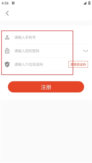 3、在注册页依次填写【请输入手机号】-【请输入您的密码】,点击【获取验证码】,完成信息填写后点击【注册】。