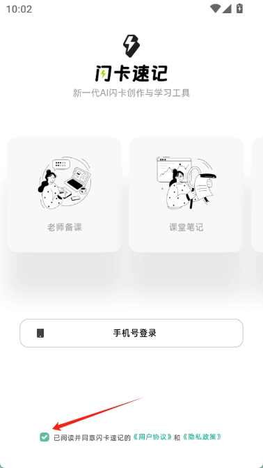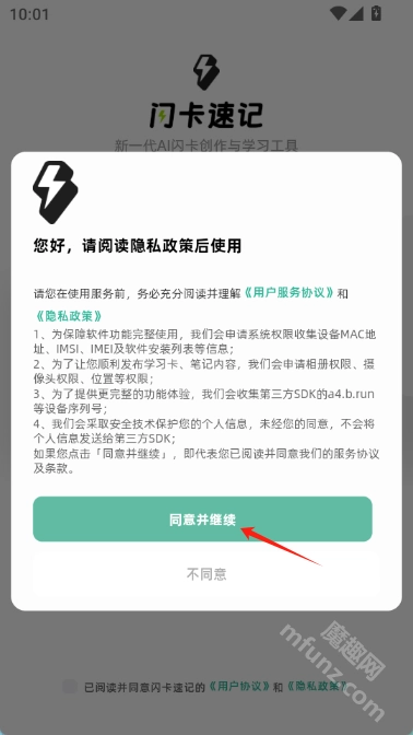 1. 前往魔趣网(m.mfunz.com)安装闪卡速记应用,打开应用后点击“同意并继续”按钮