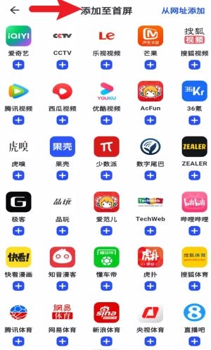 在添加页面里挑选常用网站的图标,点击“+”号就能把对应的网站添加到浏览器首页的快速入口中。