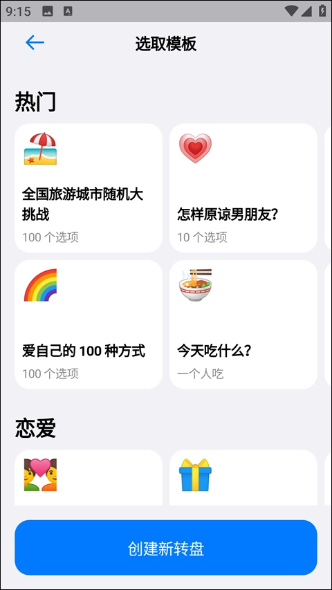 2、在这里能看到有不少模板可供选择,接着我们点击下方的“创建新转盘”按钮。