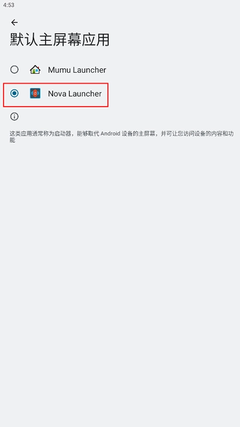2、在“默认主屏幕应用”选项中选择“Nova Launcher”就可以了。