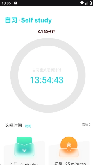 2、在自习室页面里选择添加时间,接着开启自习室功能。