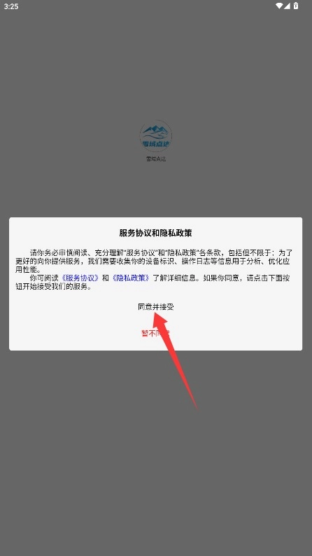1、初次使用需阅读平台服务条款与隐私政策,确认后点击同意并接受按钮进入应用。
