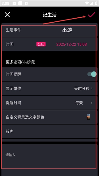 3、进入“记生活”界面后,填写事件名称与时间,根据需求设置提醒、显示单位等相关选项,随后点击确认按钮完成保存操作。
